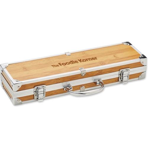 3teiliges BBQ-Set mit Messer, Grillgabel und Messerschärfer. Edelstahl mit Griffen aus Holz. Lieferung im Koffer aus Aluminium in Holzoptik.