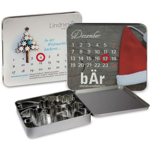 Die etwas andere Art von Adventskalender. Mit dem kleinen Magnetring markieren Sie das aktuelle Datum. Im Inneren der silbernen Dose sind 4 weihnachtliche Backförmchen enthalten. Der Deckel ist komplett individuell im Digitaldruck bedruckbar. Die Backförmchen sind aus Edelstahl gefertigt und spülmaschinenfest. Inklusive Werbedruck, zuzüglich Druckvorkosten. Lieferzeit: 3-4 Wochen.