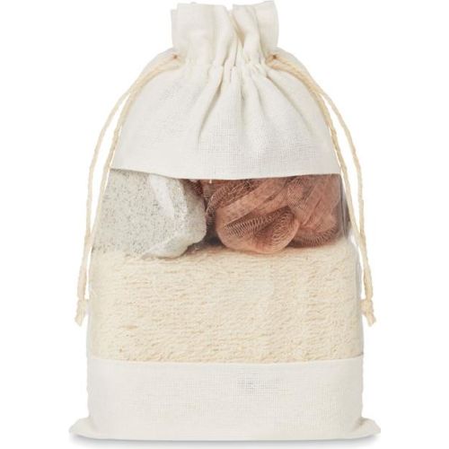 Bade-Set mit zwei unterschiedlichen Schwämmen und einem Bimsstein. Lieferung im Jute-Beutel mit PEVA-Sichtfenster.