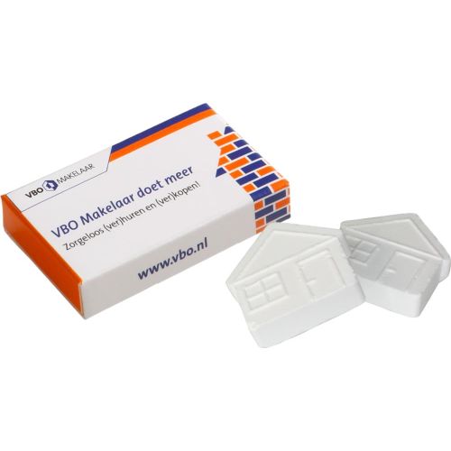 Box mit 2 Häuschen Pfefferminz, 4c-Euroskala bedruckt. Lieferzeit: ca. 2 Wochen. Haltbarkeit: ca. 36 Monate. Lagerhinweis: Raumtemperatur. Auf Anfrage gegen Aufpreis auch lieferbar mit zuckerfreien Pfefferminz.