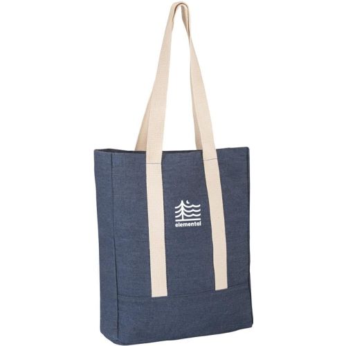 Tragetasche (300 g/m²) aus Denim. Hat eine Innentasche mit Reißverschluss, verstarkte Nahten und 64cm lange Baumwollhenkel. 340 x 390 x 100 mm
