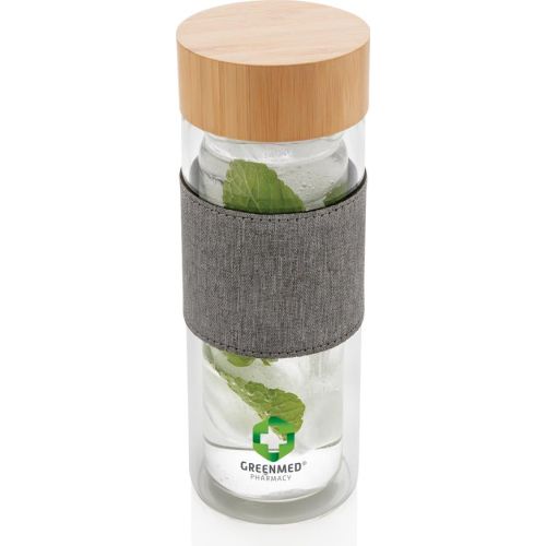 Kaufen Sie keine Plastikwasserflaschen mehr im Geschäft, sondern verwenden Sie Ihre eigene Flasche aus der Impact Collection wieder. Die Verwendung von haltbaren Materialien wie Glas oder Edelstahl ist im Vergleich zu Einwegprodukten um ein Vielfaches nachhaltiger.Weiterhin werden 2% des Erlöses jedes verkauften Impact-Produkts an Water.org gespendet.Glasflaschen bedeuten weniger Plastikmüll. Diese Flasche mit Bambusdeckel, hergestellt aus hochwertigem Borosilikatglas lässt Sie, da sie doppelwandig ist, nun auch heiße Getränke mitnehmen. Ein schickes Sleeve komplettiert den Look. Kapzität 360 ml. BPA frei. Gebrauch von Bisphenol A-freien Materialien, Konformität mit der deutschen Lebensmittelsicherheitsgesetzgebung ( LFBG), Konformität der Richtlinie für den Inhalt von Phtalaten, frei von einzel- und mehrkettige, chlorinierten Paraffinen. Verpackung: Geschenkverpackung.