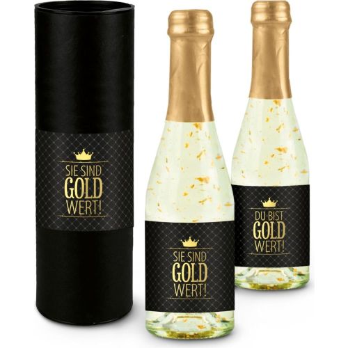 100% Wertschätzung! Zeigen Sie Ihren Mitarbeitern oder Kollegen, wie wertvoll diese für Ihr Unternehmen sind: eben einfach „Gold” wert! Die spritzige Golden Flakes Secco Piccolo Flasche (0,2 l - aromatisiertes, weinhaltiges Getränk) mit (lebensmittelechtem) 22-karätigem Blattgold unterstreicht Ihre Botschaft. Die goldenen Flöckchen wirbeln eindrucksvoll in der Flasche und im Glas, besonders beim beherzten Anstoßen! Verpackt in einer wunderschönen, schwarz-matten Geschenkhülse, die ebenfalls Ihre Botschaft trägt. Erhältlich in der „Du” und „Sie” Variante. Standardartikel unveredelt versandfertig in ca. 2-3 Tagen, veredelte Ware versandfertig in ca. 2-3 Wochen. Expressversand möglich. Lieferung erfolgt ab Werk. Bitte hier klicken: Zusatz-Infos nach Lebensmittel-Informationsverordnung.