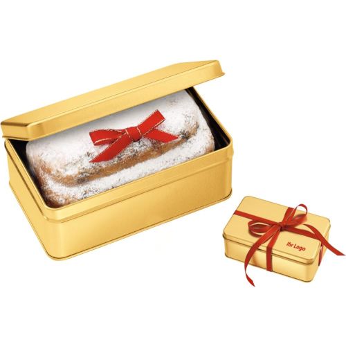 Eine hochwertige, goldene Stülpdeckeldose mit Schleifenband rot, gefüllt mit: 1 Gourmet-Christstollen 200 g. Der Gourmet-Stollen wird aus erlesenen Zutaten gebacken und kann auf der transparenten Verpackung mit einem 4c Etikett individualisiert werden. Der Deckel der Goldbox kann mit einem 1c Druck, mit einem 4c Etikett oder einem 4c Anhänger am Schleifenband veredelt werden. Inhaltsangaben: 27% Rosinen, Weizenmehl, Palmfett*, Zucker, Dextrose, Glukose-Fruktose-Sirup, Mandeln, Rapsöl, Feuchthaltemittel: Sorbit; Orangenschalen, Hefe, Weizenstärke, Zitronenschalen, Emulgatoren: Mono- und Diglyceride von Speisefettsäuren, Natriumstearoyl-2-lactylat; natürliches Aroma, Salz, Stärke, ganz gehärtetes Palmfett*. (*zertifiziertes nachhaltiges Palmöl). Nährwert: Durchschnittliche Nähwerte pro 100 g: Energie: 1682 kJ/402 kcal, Fett: 17 g, davon gesättigte Fettsäuren 8,0 g, Kohlenhydrate: 57 g, davon Zucker 39 g, Eiweiß: 4,2 g, Salz: 0,35 g. Allergene: Dieses Produkt kann Spuren von weiteren Schalenfrüchten, Ei und Milchprodukten enthalten.