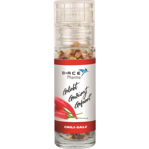 Chili-Salz, Grillgewürz, Grillsalz, Gorumet-Salz, Knoblauch-Salz, Brotzeit-Gewürz, Kräuter-Salz, Salz & Pfeffer oder Weihnachtsgewürz in einer handlichen Gewürzmühle aus Glas, mit verstellbarem Mahlwerk für grobe und feine Vermahlung der Gewürze. Natursalz (=Steinsalz). Inkl. 4c-Etikett, Druckvorkosten bereits inklusive. Haltbarkeit: ca. 24-36 Monate. Lieferzeit: ca. 3-4 Wochen nach Druckfreigabe.