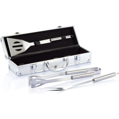 3tlg. Edelstahl Grillset, inkl. Bratenheber, Grillzange und -gabel mit Schutzhülle, Set konfektioniert in Aluminiumkoffer. Frei von einzel- und mehrkettige, chlorinierten Paraffinen, Konformität zur SVHC-Richtlinie 1907/2006/EC, Konformität mit der deutschen Lebensmittelsicherheitsgesetzgebung ( LFBG), Gebrauch von Bisphenol A-freien Materialien. Verpackung: Neutrale Einzelverpackungung.