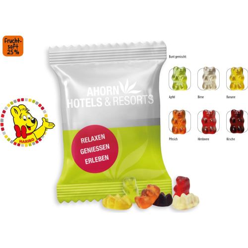 Die kleinen saftigen Bärchen bieten ein intensives Fruchtgummi-Erlebnis. Mit einem Fruchtsaftanteil von 25 % und einer weichen Konsistenz sind diese Bärchen der perfekte fruchtige Snack für unterwegs, der jede Tüte mit saftigem Geschmack füllt. Inhalt: ca. 10 g. Geschmack: Apfel, Banane, Birne, Himbeere, Kirsche, Pfirsich mit jeweils 25 % Fruchtanteil. Haltbarkeit: 10 - 12 Monate bei sachgerechter Lagerung. Lieferzeit: ca. 15 Arbeitstage nach Druckfreigabe. Zutaten: Glukosesirup; Fruchtsaft aus Fruchtsaftkonzentrat: Apfel, Himbeere, Zitrone, Pfirsich, Kirsche, Orange, Banane; Zucker; Gelatine; Dextrose; Säuerungsmittel: Citronensäure; Sonnenblumenöl; Frucht- und Pflanzenkonzentrate: Saflor, Spirulina, Apfel, Holunderbeere, Schwarze Johannisbeere, Orange, Kiwi, Aronia, Traube, Zitrone; Holunderbeerextrakt; Aroma; Überzugsmittel: Bienenwachs weiß und gelb. Kann Spuren von MILCH, WEIZEN enthalten. Nährwerte pro 100 g: Energie: 1437 kJ/338 kcal; Fett: 0,5 g, davon gesättigte Fettsäuren: 0,1 g; Kohlenhydrate: 77 g, davon Zucker: 46 g; Eiweiß: 5,7 g; Salz: 0,03 g.