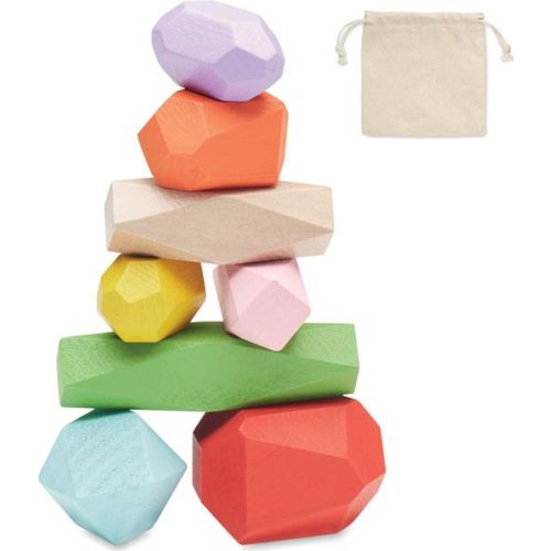 8 bunte, stapelbare Holzbausteine im Beutel aus Baumwolle mit Kordelzug.