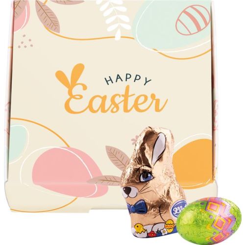 Kleine Klappbox aus weißem Karton, mit Schoko Ostereier und Schoko Osterhase (verschiede Marken lieferbar), Box individuell bedruckt. Lieferzeit: ca. 10-20 Arbeitstage nach Druckfreigabe. Bitte hier klicken: Zusatz-Infos nach Lebensmittel-Informationsverordnung. Bei Bedarf können Sie aus einer Vielzahl von kostenlosen Gestaltungsvorlagen auswählen. Nutzen Sie hierfür das PDF "Motivvorlagen" auf dieser Seite.