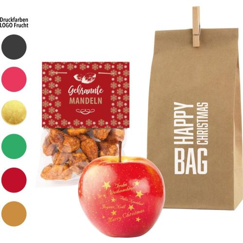 Ein Qualitäts-Apfel rot inkl. LOGOFrucht Druck "Frohe Weihnachten" in der Farbe Goldberry und 1 Beutel gebrannte Mandeln 30 g, verpackt in einer natürlichen Papiertüte mit Aufdruck "Happy Christmas Bag" und Holzklammer. Der LOGOFrucht Apfel wird mit einer lebensmittelechten Farbe bedruckt, dabei wird die Oberfläche im Gegensatz zur Laserung nicht verletzt und der Apfel hat somit eine deutlich längere Haltbarkeit. Die Tüte kann mit einem 4c oder 1c Druck, einem 4c Aufkleber, oder einem 4c Reiter (hierbei können Vorder- und Rückseite bedruckt werden) individuell gestaltet werden. Optional kann zusätzlich die Rückseite des Apfels mit Logo oder Werbebotschaft bedruckt werden.