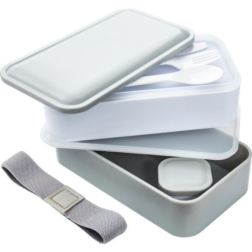 Die Lunchbox mit Dressingschale für Salatsoßen, Picknickbesteck, zwei voneinander trennbaren Behältern mit Deckel und hübschem,verbindenden Gummiband ist ein unverwechselbarer Pausenfüller für Genießer. Inkl. Besteck-Set. BPA-frei.