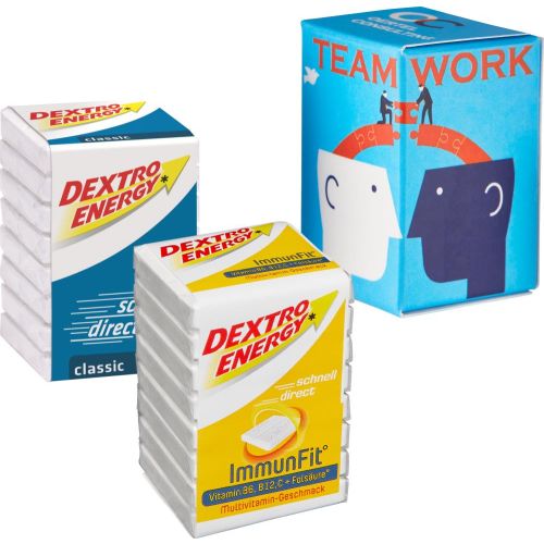 Mini-Kartonage in Towerform, befüllt mit 8er Würfel DEXTRO ENERGY*, Classic oder IMMUNFIT (Vitamin C, B6, B12, C ), sortenrein, in handelsüblicher Ausführung. *enthält Kohlenhydrate. Enthält: Classic: Energieliefernde Dextrose Täfelchen. Zutaten: Dextrose (89%), Maltodextrin, Säuerungsmittel (Citronensäure), Trennmittel (Magnesiumsalze der Speisefettsäuren), Aromen. Immunfit: Energieliefernde Dextrosetäfelchen mit Multivitamin-Geschmack und 10 Vitaminen. Zutaten: Dextrose (88%), Maltodextrin, Säuerungsmittel (Citronensäure), Trennmittel (Magnesiumsalze der Speisefettsäuren), Aroma, Thiamin, Riboflavin, Vitamin B6, Vitamin B12, Vitamin C, Vitamin E, Niacin, Biotin, Folsäure, Pantothensäure. Füllvariante: DEXTRO ENERGY* 8er Würfel (handelsübliche Ausführung), *enthält Kohlenhydrate. classic: Nährwerte pro 100g: Energie 1562kJ / 368kcal; Fett 0,5g; davon gesättigte Fettsäuren 0,3g; Kohlenhydrate 91g; davon Zucker 82g; Eiweiß 0g; Salz 0,01g. Immunfit: Nährwerte pro 100g: Energie 1560kJ / 367kcal; Fett 0,5g; davon gesättigte Fettsäuren 0,3g; Kohlenhydrate 90g; davon Zucker 81g; Eiweiß 0g; Salz 0.01g; Vitamin C 80mg = 100%*; Niacin 16mg = 100%*; Vitamin E 12mg = 100%*; Pantothensäure 6mg = 100%*; Riboflavin 1,4mg = 100%*; Vitamin B6 1,4mg = 100%*; Thiamin 1,1mg = 100%*; Folsäure 200µg = 100%*; Biotin 50µg = 100%*; Vitamin B12 2,5µg = 100%*. *des Nährstoffbezugswertes (NRV). Trocken lagern. Vor Wärme schützen. Haltbarkeit: ca. 12 Monate bei sachgerechter Lagerung.