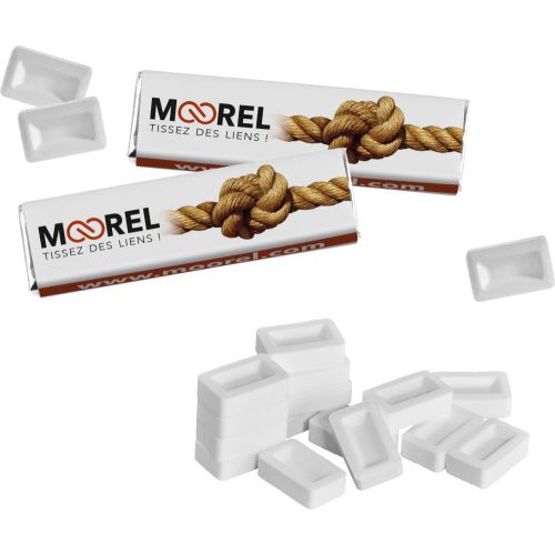 Pfefferminzriegel in silberne Alufolie mit weißer Banderole gewickelt. Enthält: Pfefferminztabletten. Zutaten: Zucker, Maltodextrin, Minzöl, Menthol, Trennmittel (Magnesiumsalze der Speisefettsäuren), Siliciumdioxid. Füllvariante: Pfefferminzriegel. Nährwerte pro 100g: Energie 1695kJ / 399kcal; Fett 0,7g; davon gesättigte Fettsäuren 0,7g; Kohlenhydrate 98g; davon Zucker 96g; Eiweiß <0,5g; Salz <0,01g. Trocken lagern. Vor Wärme schützen. Haltbarkeit: ca. 18 Monate bei sachgerechter Lagerung.