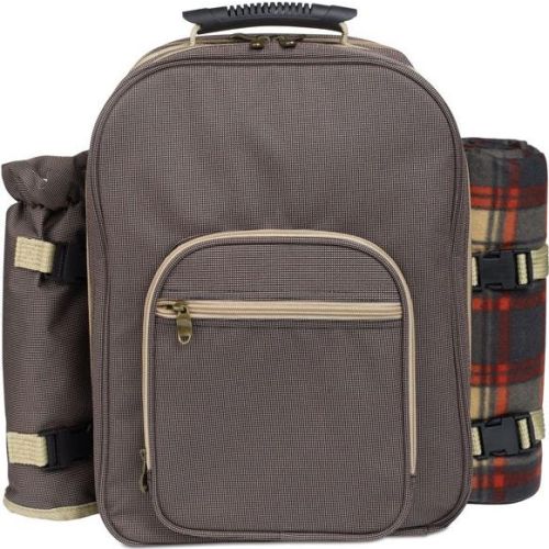 Hochwertiger Picknick Rucksack für 4 Personen, mit Decke, Flaschenfach und edlem Tischzubehör. Material: 600D Polyester.