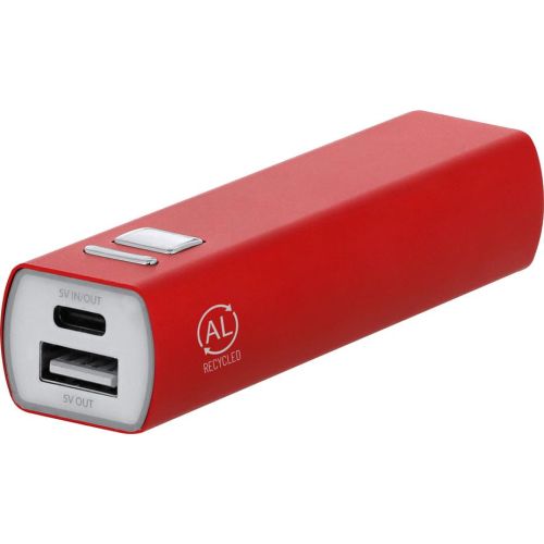 Powerbank aus recyceltem Aluminium mit 2600 mAh Akku. Mit 1 USB- und 1 USB-C-Ladeanschluss. USB-C-Eingangsanschluss. Inklusive USB-Ladekabel.