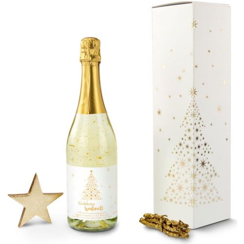 Sorgen Sie für prickelnde Momente - egal ob bei Ihren Freunden, Kollegen oder Geschäftspartnern. Unsere luxuriöse Flasche Golden Flakes (0,75 l, aromatisiertes, schaumweinhaltiges Getränk) bereitet Ihnen exquisite Momente für alle Sinne. Hier wurde einem trockenen Sekt lebensmittelechtes 22-karätiges Blattgold zugesetzt, welches stilvoll in der Flasche und im Glas herumwirbelt. Der edle Tropfen ist in einer hochwertigen weißen Kartonage mit weihnachtlicher Goldfolienprägung, sodass auch die Verpackung zum exklusiven Inhalt passt. Standardartikel unveredelt versandfertig in ca. 2-3 Tagen, veredelte Ware versandfertig in ca. 2-3 Wochen. Expressversand möglich. Lieferung erfolgt ab Werk. Bitte hier klicken: Zusatz-Infos nach Lebensmittel-Informationsverordnung.