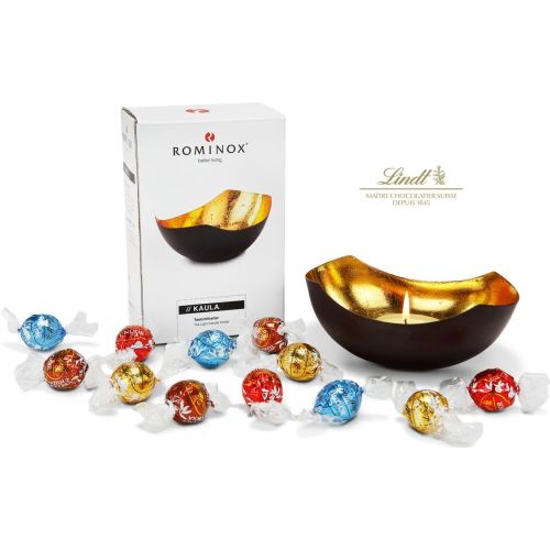 Entdecken Sie ein süßes und stimmungsvolles Geschenkset, das Ihnen den unvergleichlichen Genuss von Lindt Lindorkugeln bei dekorativem Kerzenschein ermöglicht. Dazu erhalten Sie die beliebte Teelichtschale Kaula (ca. 16,3 x 11,1 x 6,0 cm). Dieser dekorative Kerzenhalter kann mit Teelichtern oder Maxi-Teelichtern kombiniert werden (nicht im Set enthalten) und verleiht jedem Raum ein warmes und gemütliches Ambiente. Die handgearbeitete Teelichtschale besteht aus seidenmatt braun lackiertem Metall und ist mit einer eleganten Goldfolie ausgekleidet, die den Kerzenschein Gold schimmern lassen. Damit Sie sich zurücklehnen und den Kerzenschein in vollsten Zügen genießen können, enthält das Geschenkset zudem eine bunte Auswahl an köstlichen Lindt Lindorkugeln. Genießen Sie insgesamt 12 leckere Schokoladenpralinen in den Geschmacksrichtungen weiße Schokolade, Vollmilchschokolade, Stracciatella und Haselnuss (je 12,5 g). Jede Kugel verwöhnt Ihren Gaumen mit einer zartschmelzenden Schokoladenhülle und einer unwiderstehlichen Füllung. Standardartikel unveredelt versandfertig in ca. 2-3 Tagen, veredelte Ware versandfertig in ca. 2-3 Wochen. Expressversand möglich. Lieferung erfolgt ab Werk. Bitte hier klicken: Zusatz-Infos nach Lebensmittel-Informationsverordnung.