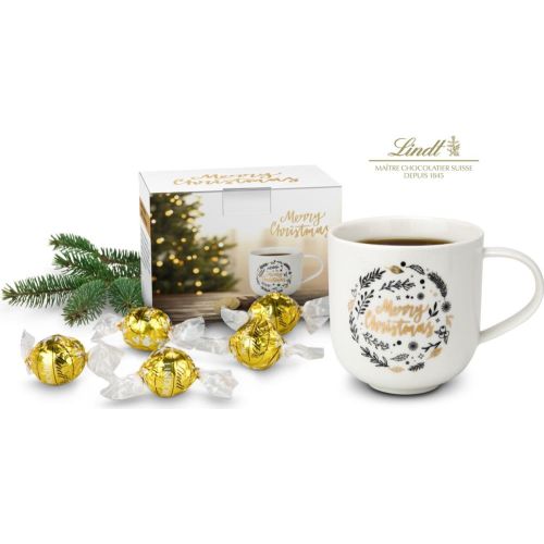 Diese edle Tasse möchte man nach Weihnachten gar nicht wegräumen. Der stimmungsvolle Porzellanbecher (350 ml) ist beidseitig bedruckt mit goldener „Merry Christmas“ Aufschrift und kommt gefüllt mit 5 goldgewickelten Lindt Lindorkugeln zum Naschen (je 12,5 g). Ein wunderschöner Begleiter, welcher schnell zur „Lieblingstasse“ in der Advents- und Weihnachtszeit wird, egal ob zu Hause oder im Büro. Standardartikel unveredelt versandfertig in ca. 2-3 Tagen, veredelte Ware versandfertig in ca. 2-3 Wochen. Expressversand möglich. Lieferung erfolgt ab Werk. Bitte hier klicken: Zusatz-Infos nach Lebensmittel-Informationsverordnung.