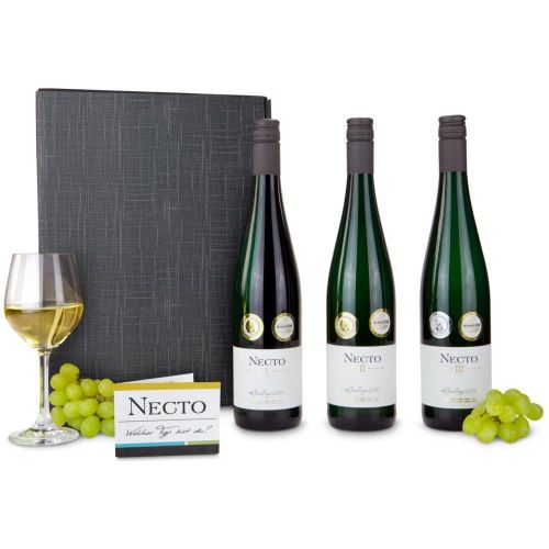 Dieses Weinset ist bestückt mit drei exzellenten Mosel-Riesling Erzeugerabfüllungen (0,75 l) vom Weingut Römerhof (ausgezeichnet mit dem Staatsehrenpreis). Damit für jeden Weinliebhaber etwas dabei ist, enthält das Set je eine Flasche Necto I (trocken), Necto II (feinherb) und Necto III (edelsüß). Die Weine, welche aus reifen, handverlesenen, hochwertigen Mosel-Steillagen-Trauben gewonnen wurden, zeichnet eine edle Balance aus Frische und Reife aus. Verpackt im schwarzen Geschenkkarton inkl. Weinbeschreibung. Standardartikel unveredelt versandfertig in ca. 2-3 Tagen, veredelte Ware versandfertig in ca. 2-3 Wochen. Expressversand möglich. Lieferung erfolgt ab Werk. Bitte hier klicken: Zusatz-Infos nach Lebensmittel-Informationsverordnung.