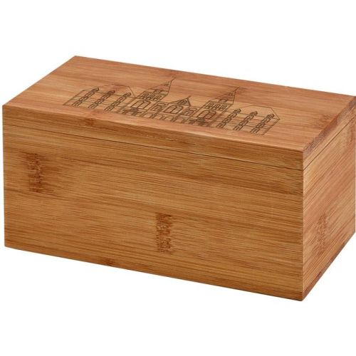Teebox aus Bambus mit 2 Fächern und einem Magnetverschluss. Die Teebox enthält 20 Teebeutel von den Azoren "Gorreana-Tee" (10 Schwarztee und 10 Grüntee). Geliefert in einer Geschenkschachtel aus Kraftpapier. Da das Produkt aus natürlichen Materialien hergestellt wird, können Farbe des Produkts sowie das Druckergebnis von Produkt zu Produkt unterschiedlich sein. 160 x 87 x 78 mm | Kraftpapier Schachtel: 166 x 91 x 87 mm