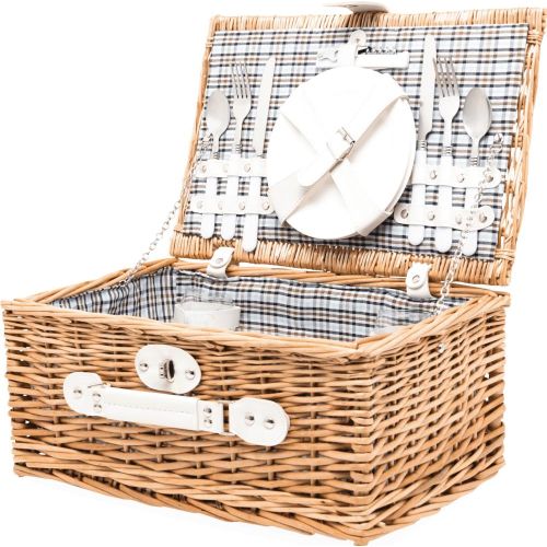 Weiden-Picknickkorb KINGS PARK für 2 Personen: inkl. Edelstahl-Besteck mit Kunststoffgriffen, Teller aus Keramik, Weingläser, Stoffservietten und ein Kellnermesser, mit Tragegriff und Drehverschluss.