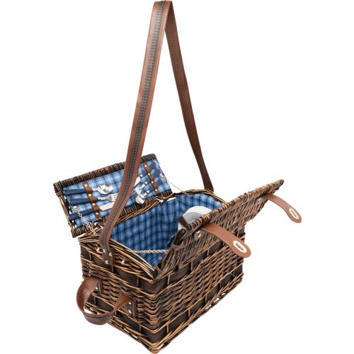 Weiden-Picknickkorb SUMMERTIME für 4 Personen: inkl. Edelstahl-Besteck mit Kunststoffgriffen, Keramikteller, Kunststoff-Weingläser, innen mit Befestigungsgurten, außen seitliche Tragegriffe, Schultergurt und Drehverschluss.