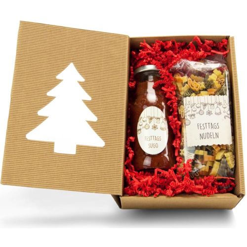 Wer an Weihnachten genug von all den süßen Naschereien hat, der findet in diesem Set eine gelungene Alternative: fröhlich, winterliche Festtagsnudeln (250 g) in Tannenbaumform kombiniert mit einem Glas fruchtigem Sugo (250 ml). Alles gebettet auf rotem Sizzle und verpackt in einem winterlichen Naturkarton mit Tannenbaum-Sichtfenster - so dass man schon von außen einen Blick auf den Inhalt erhaschen kann. Standardartikel unveredelt versandfertig in ca. 2-3 Tagen, veredelte Ware versandfertig in ca. 2-3 Wochen. Expressversand möglich. Lieferung erfolgt ab Werk. Bitte hier klicken: Zusatz-Infos nach Lebensmittel-Informationsverordnung.