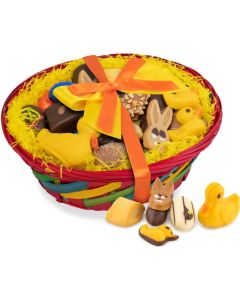 Pralinen-Vielfalt in einer fröhlichen Präsentdose: 12 ausgewählte Pralinen und Trüffel (z.T. mit Alkohol), handgemacht mit den besten Zutaten, verpackt in einer fröhlichen, österlichen Präsentdose. Hier ist jede Praline ein Unikat und ein Genuss für alle Sinne. Wählen Sie aus vier Motiven.