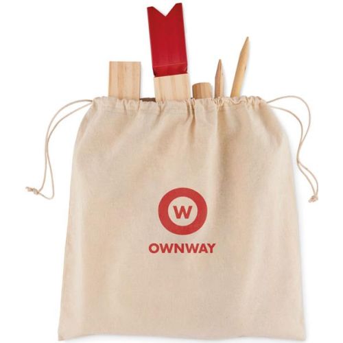 Outdoor-Wurfspiel aus Kiefernholz, verstaut in einem Beutel aus Baumwolle mit Kordelzug. Dieses aus Schweden stammende Spiel ist ein großer Spaß für Kinder und auch Erwachsene. Spielen Sie es mit der Familie oder mit Freunden im Freien. Ziel ist es, die größeren Holzblöcke der gegnerischen Mannschaft mit den kleineren umzuwerfen. Der König wird zuletzt umgeworfen. Die Mannschaft, die als Erster die gegnerischen Blöcke umwirft, hat gewonnen. Enthält 10 Bauern, 4 Markierungspfähle, 6 Wurfhölzer und 1 König.